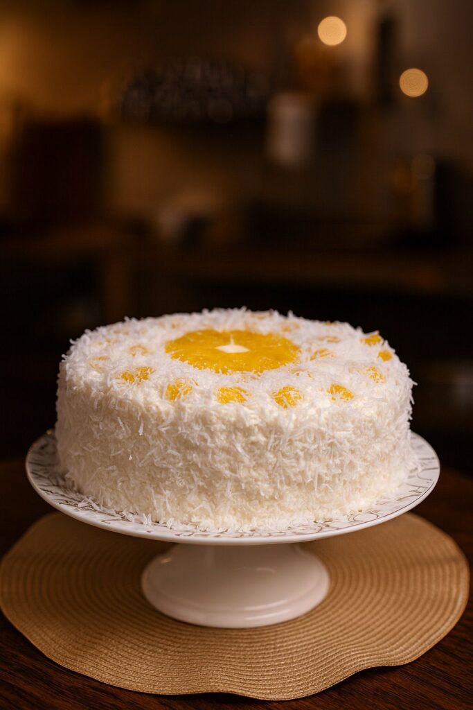 Pão de ló branquinho, molhado com calda de abacaxi, recheado com um delicioso recheio maravilha encorpado com compota de abacaxi, coberto com marshmallow, coco e pedaços de abacaxi por cima.