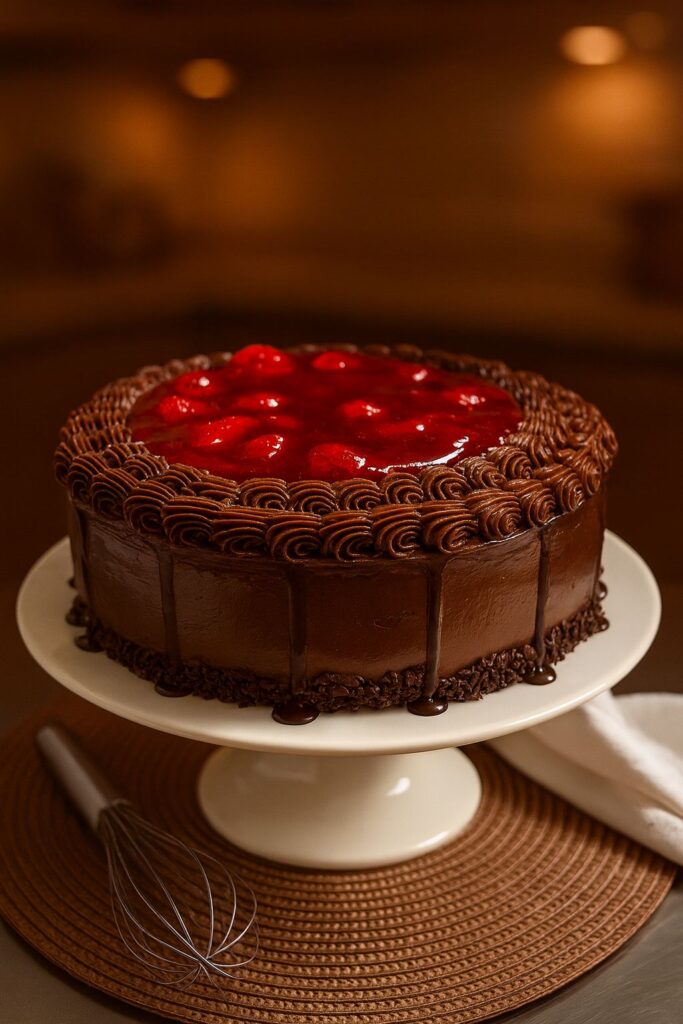 Massa de chocolate recheada com um delicioso mousse trufado com raspas de chocolate branco. Coberto com ganache e morangos.