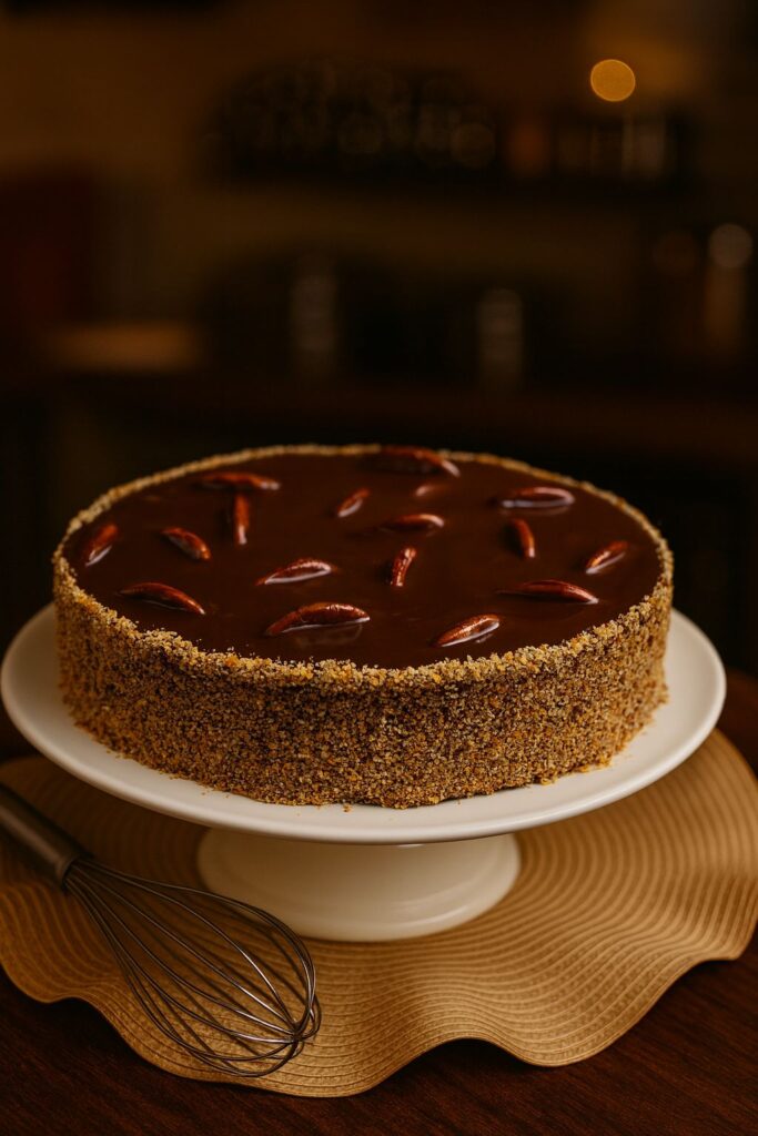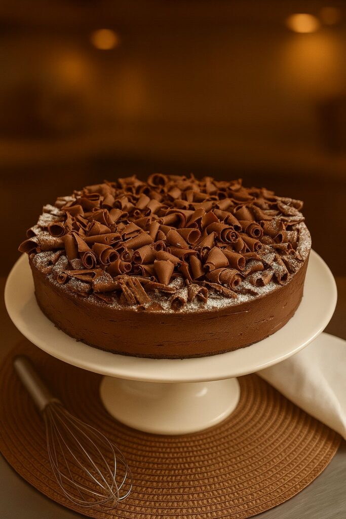 Massa leve de cacau recheada e coberta com brigadeiro e confeitada com ganache e raspas de chocolate