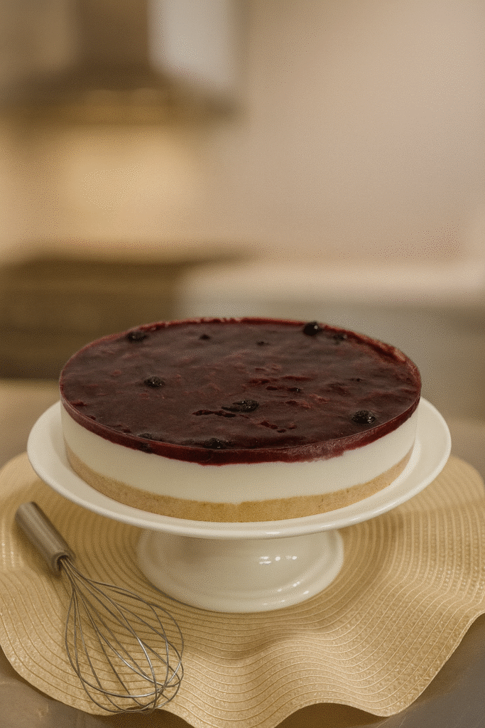 Delicioso creme de queijo sobre fina camada de biscoito e coberto de geleia de amora.