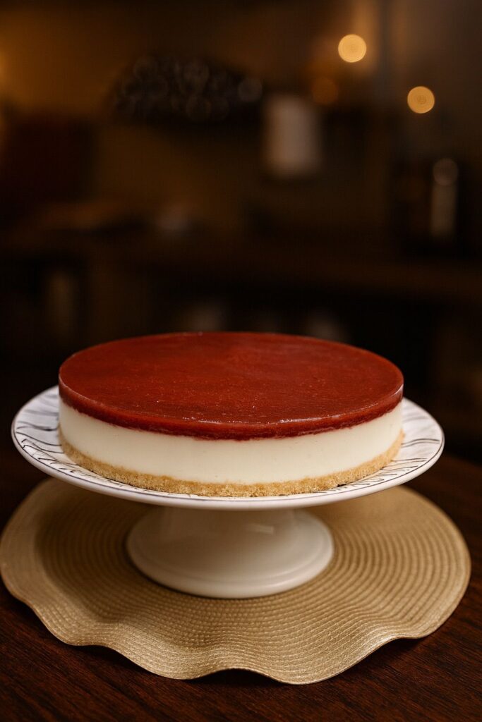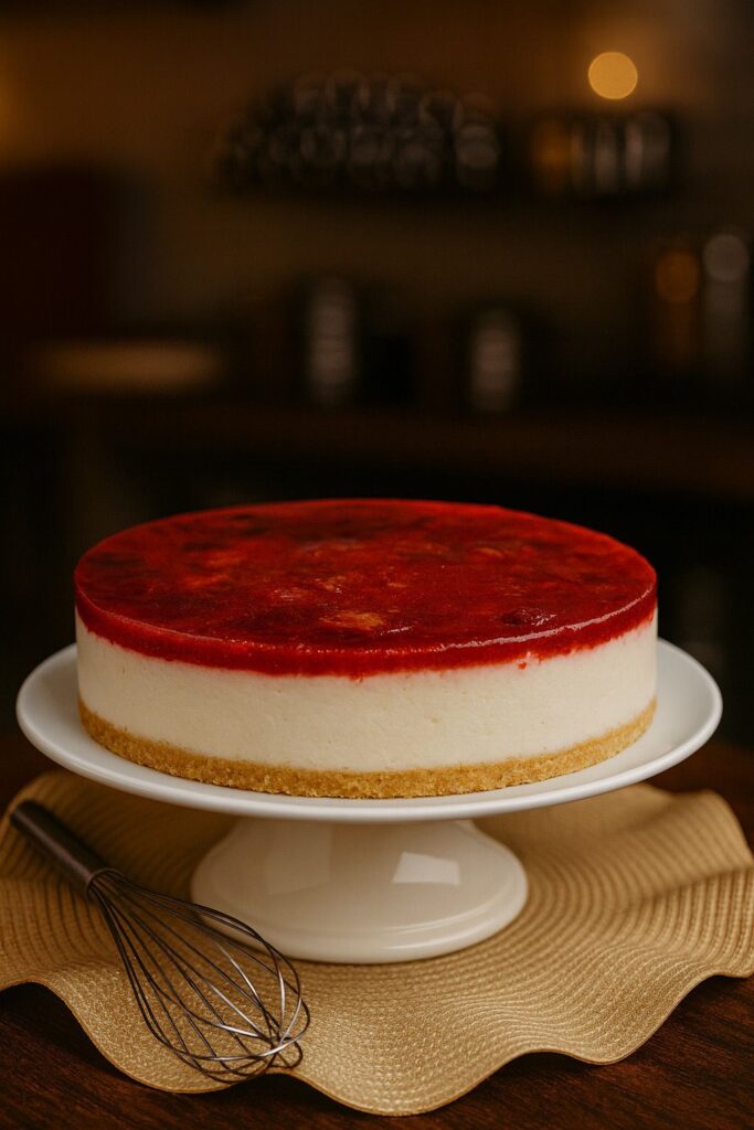 A Torta Cheesecake Morango é um delicioso creme de queijo sobre fina camada de biscoito coberto com geleia de morango.